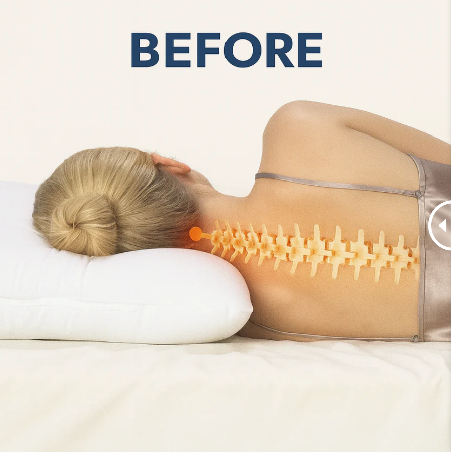 On the left, a regular pillow that bends the neck and compresses the vertebrae. On the right, our ergonomic pillow keeps your head and spine perfectly aligned for tension-free, pain-free sleep.